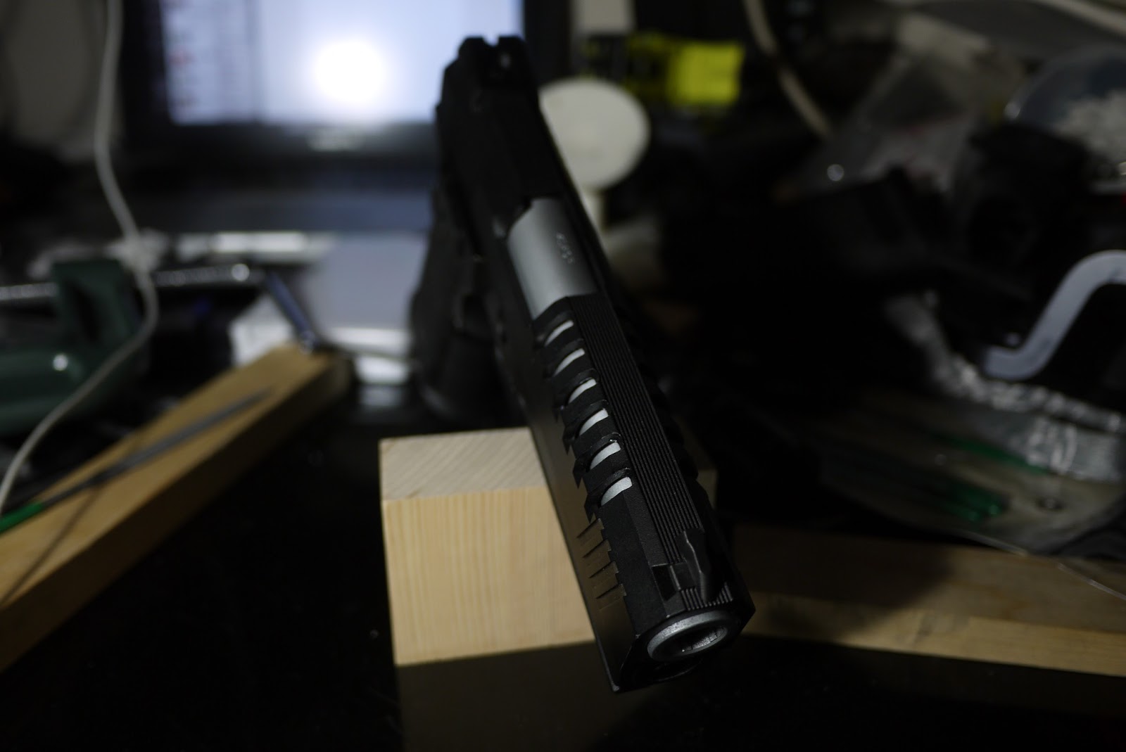 とりあえずスライドを肉抜きしてみました。この形状のABS製カスタムスライド、ハイキャパ4.3用は出てないんですよね。メタルスライドはそもそもグレーゾーンな上に重量上がって折角のハイキャパの動きの良さが損なわれるので使わない方向でいきました。