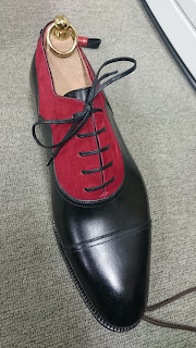 私はこの靴のデザインがけっこう好きです。特にかかとの部分の、革を当てず切込みも入れていない丸い形状や赤と黒のコンビは個性的でかなり気に入っています。